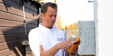 Svar: En certifierad jourelektriker från vår partner Svenska Eljouren, som är verksam i Båstadsområdet.